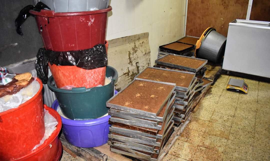 وتم حجز 960 كلغ من العجائن المجمدة والمحشوة بمادة الشكولاطة، 6 أوعية بلاستيكية بداخلها مادة الدقيق محضر لصنع الحلويات ( الشامية ) قدرت بـ 500كلغ. غير صالحة للإستهلاك البشري ولا تخضع لشروط النظافة والصحة.