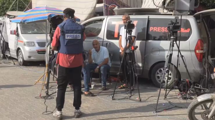 في بداية النزاع، كانت وسائل الإعلام الموجودة في الأراضي الفلسطينية تعمل من مكاتبها في مدينة غزة. وأجبرهم القصف الإسرائيلي المكثف، الذي دمر العديد من الأبراج، على إرسال فرقهم نحو الجنوب. واستقر عدة مئات، منهم في مدينة خان يونس، في خيام نصبت في باحة مستشفى ناصر.
