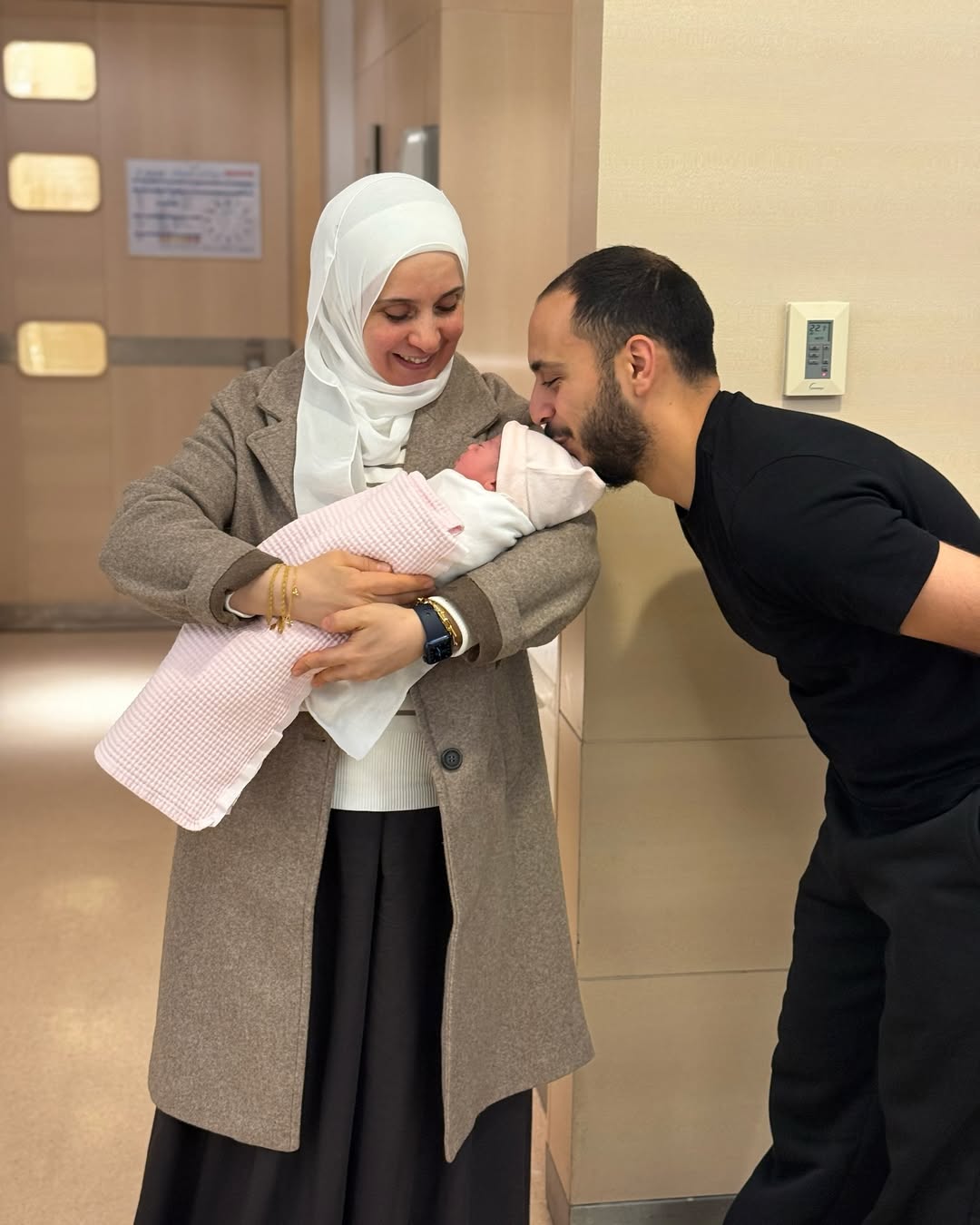 وظهر من خلالها وهو يحمل مولودته، بينما ظهرت والدته السيدة مروة حماد، وهي تحمل الرضيعة في صور أخرى.