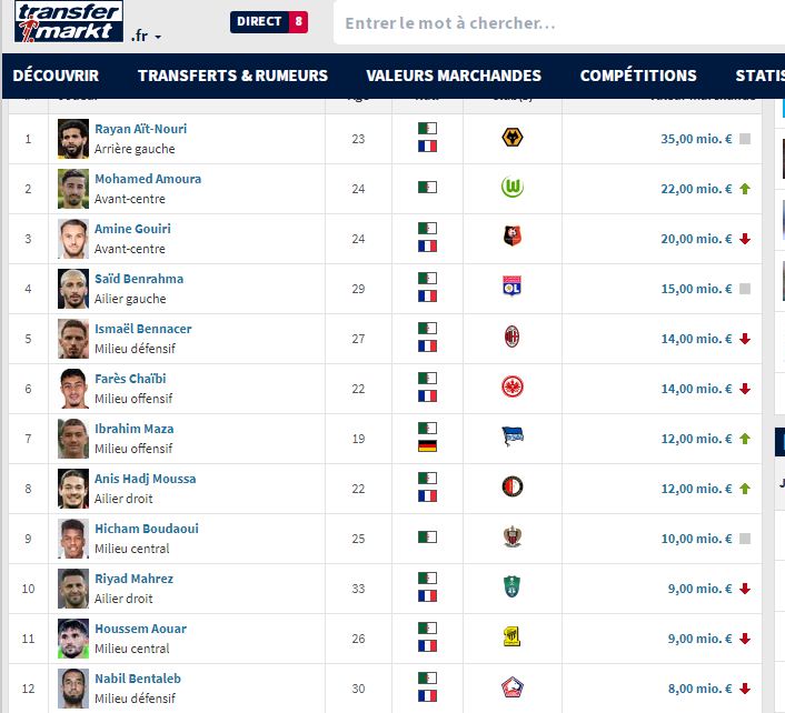 وبات بذلك، ابن مدينة جيجل، في المركز الثاني لأغلى لاعبي المنتخب. خلف المتصدر ريان آيت نوري، لاعب وولفرهامبتون الانجليزي، بـ 35 مليون أورو، ومتقدما على أمين غويري. لاعب نادي رين الفرنسي، بـ 2 مليون أورو.