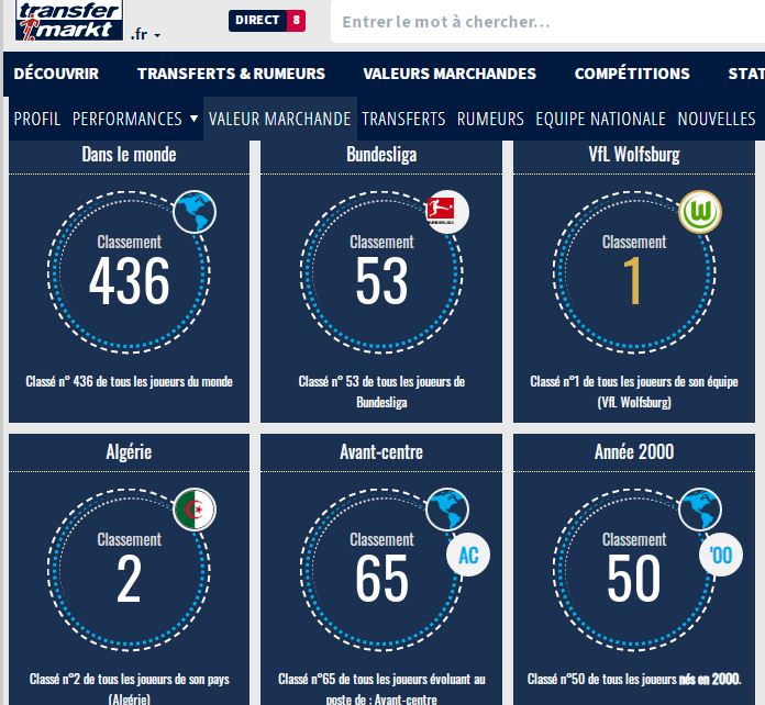 وحسب ذات الشبكة المختصة في انتقالات اللاعبين، فإن عمورة، يحتل المركز الـ 436 عالميا، في قائمة أغلى اللاعبين، والمركز الـ 53 في “البوندسليغا” والأول في ناديه فولسبورغ. والـ 50 ما بين المولودين سنة 2000، والـ 65 عالميا في منصب مهاجم صريح.