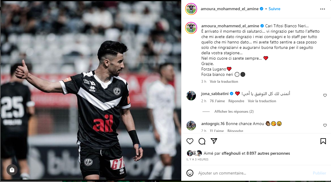 نشر الدولي الجزائري محمد أمين عمورة، اليوم الثلاثاء، رسالة وداع لنادي لوغانو السويسري وجماهيره بعدما قرر المغادرة.