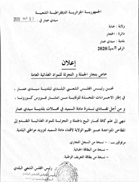 أنهت بلدية سيدي عمار بعنابة إلى علم كل تجار التجزئة والجملة للمواد الغدائية التقدم إلى المطاحن المتواجدة عبر إقليم الولاية لاقتناء مادة السميد.