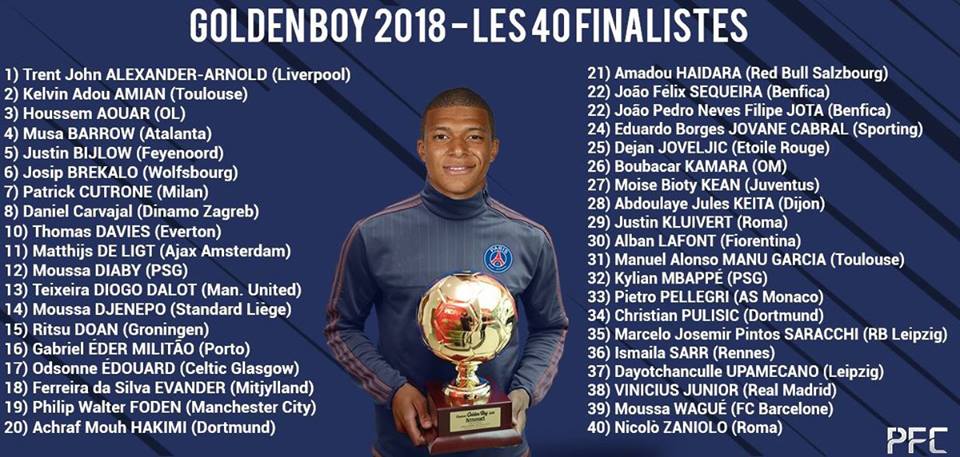 أعلنت صحيفة “توتوسبورت” الايطالية، اليوم الثلاثاء، عن القائمة النهائية عن القائمة النهائية للاعبين الشباب المرشحين بالفوز بجائزة الفتى الذهبي لعام 2018.