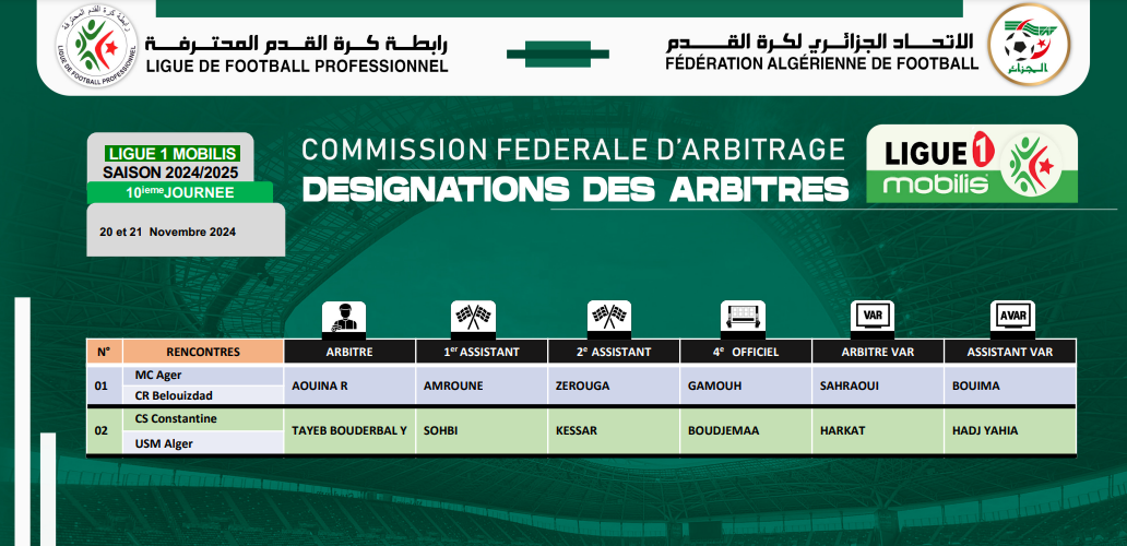 كشف الاتحاد الجزائري لكرة القدم “الفاف، اليوم الأحد، عن تعيينات حكام المباريات المقدمة. عن الجولة العاشرة من البطولة المحترفة.