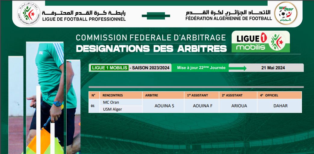 أسندت لجنة التحكيم التابعة للاتحادية الجزائرية لكرة القدم “فاف”، مهمة إدارة اللقاء المتأخر عن الجولة 22، بين مولودية وهران واتحاد العاصمة، للحكم سعيد عوينة.