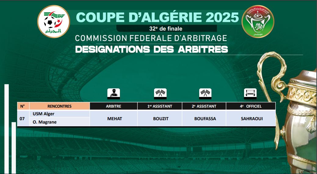 وستدير الحكمة غادة محاط، التي تحمل الشارة الدولية منذ سنة 2022، مباراة الاتحاد والمقرن. بمساعدة كل من بوزيت وبوفاسة، بينما سيكون صحراوي حكما رابعا.