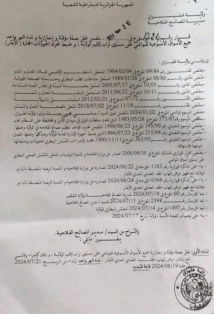 وقع والي ولاية غليزان سامي مجوبي قرار يقضي بغلق الأسواق الأسبوعية للمواشي على مستوى إقليم الولاية مؤقتا لمدةشهر ابتداء من 21 جويلية 2024.