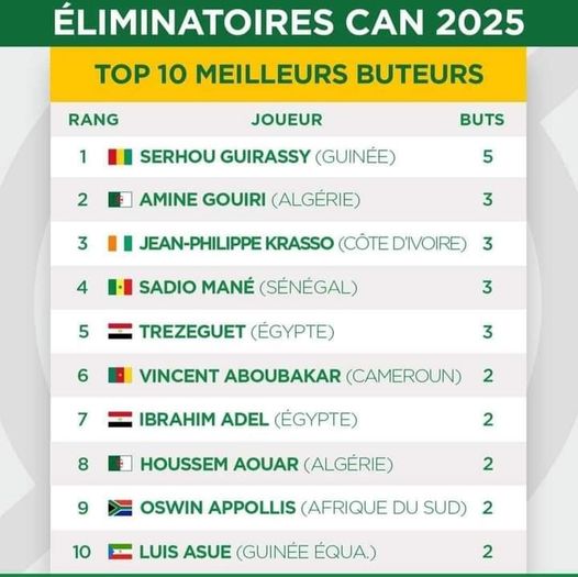 تواجد الدولي الجزائري أمين غويري في المركز الثاني برصيد ثلاثة أهداف ضمن ترتيب الهدافين في تصفيات كأس أمم إفريقيا 2025.