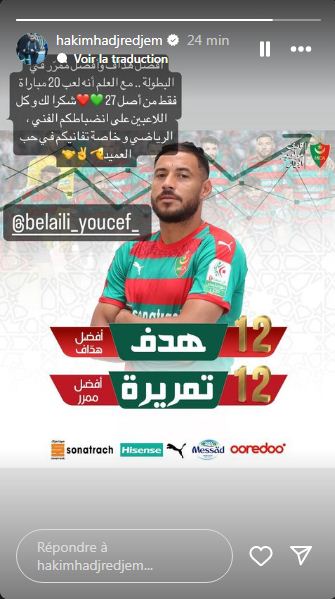 ورد رئيس المولودية، على بيتكوفيتش، عبر خاصية “ستوري” في حسابه على “أنستغرام” حينما نشر أرقام بلايلي، مع الفريق وقال: “أفضل هداف وأفضل ممرر في البطولة.. مع العلم أنه لعب 20 مباراة من أصل 27.”