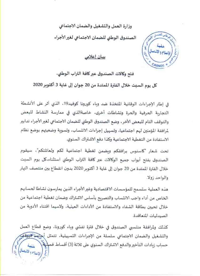 أعلن الصندوق الوطني للضمان الإجتماعي لغير الأجراء عن فتح جميع وكالات الصندوق عبر كافة التراب الوطني كل يوم سبت.