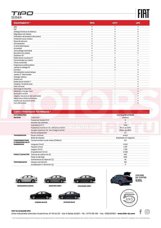 كما نشرت ” فيات الجزائر FIAT Algérie” قائمة مواصفات ومميزات لهذه السيارات حتى يتمكن المواطنين من التعرف اكثر على سيارة تيبو.