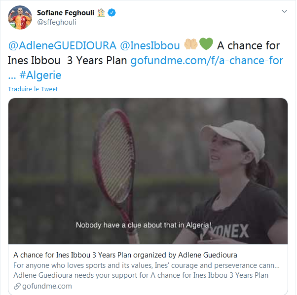 وقام سفيان فيغولي، اليوم الإثنين، بإعادة نشر تغريدة زميله قديورة، على “تويتر”، من أجل دعم حملة مساعدة بطلت التنس الجزائرية في تحقيق حلمها.