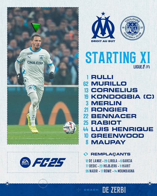 تواجد الدولي الجزائري إسماعيل بن ناصر في التشكيلة الأساسية لفريق أولمبيك مارسيليا التي ستواجه نادي تولوز ضمن مباريات الجولة الـ 28 من الليغ 1.