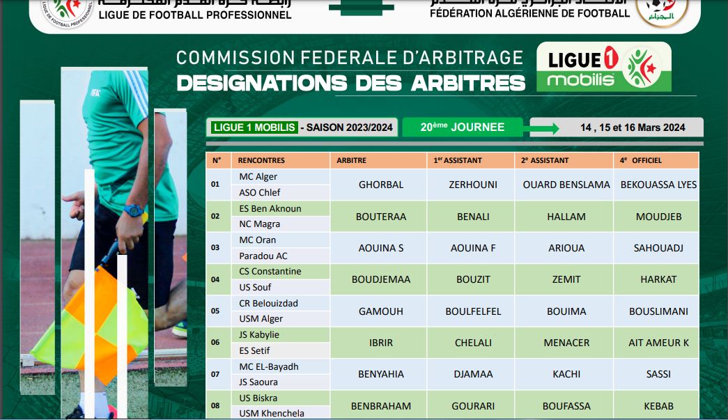 فيما جاءت تعيينات لقاءات الجولة الـ 20. التي ستنطلق هذا الخميس بمواجهة مولودية الجزائر والضيف أولمبي الشلف، وتستكمل السبت القادم على النحو التالي: