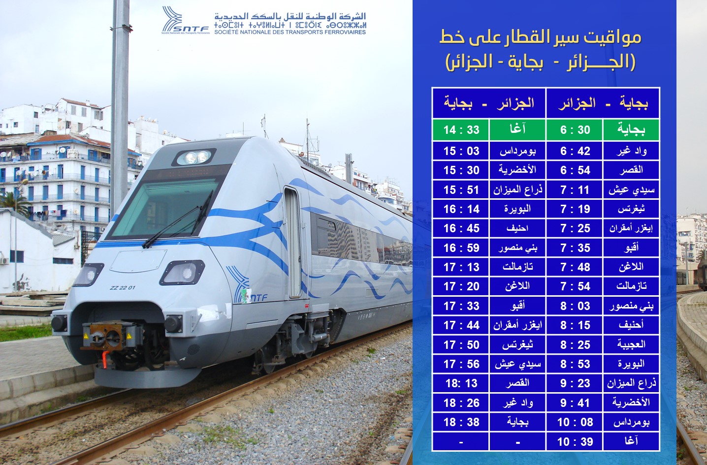 ويكون الإنطلاق من بجاية نحو محطة آغا “الجزائر” على الساعة السادسة والنصف صباحا.، كما يكون الانطلاق من محطة آغا “الجزائر” نحو بجاية على الساعة 33 : 14.