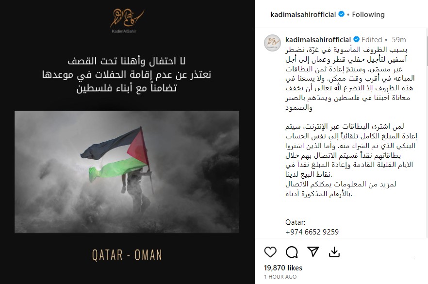 وعلق كاظم الساهر على الصورة قائلاً: “بسبب الظروف المأساوية في غزّة، نضطر آسفين لتأجيل حفلي قطر وعمان إلى أجل غير مسمّى. وسيتمّ إعادة ثمن البطاقات المباعة في أقرب وقت ممكن. ولا يسعنا في هذه الظروف إلا التضرع لله تعالى أن يخفف معاناة أحبتنا في فلسطين ويمدّهم بالصبر والصمود”.