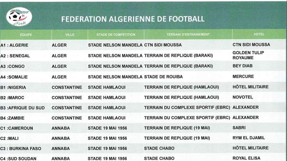 كشفت لجنت تنظيم كأس أمم إفريقيا لأقل من 17 عاما، والمقررة بالجزائر، أماكن اقامة وتدريبات المنتخبات المشاركة.