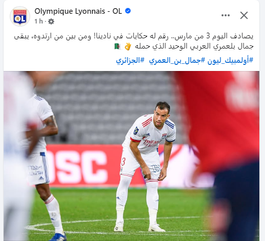 ونشر النادي الفرنسي، اليوم الاثنين، عبر الصفحة الرسمية الناطقة باللغة العربية على فيسبوك. صورة للدولي الجزائري جمال بن العمري مرتدياً القميص رقم 3.