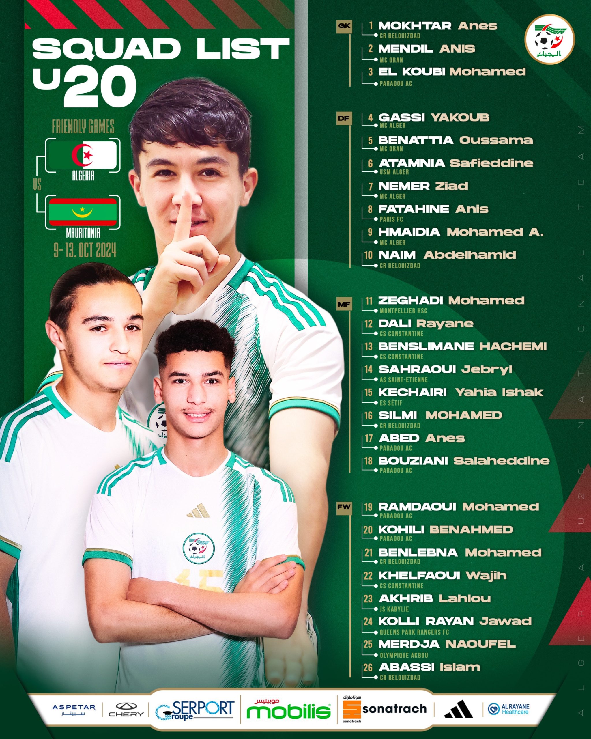 وحدد الناخب باسين مانع، قائمة تضم 26 لاعبا، للمشاركة في التربص المقبل، المقرر ما بين 5 و14 أكتوبر الجاري بالعاصمة.