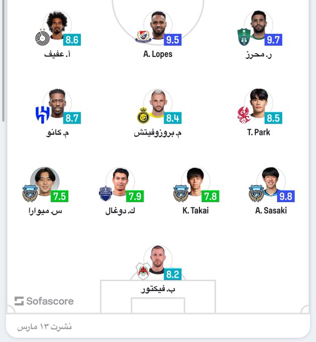 وكشف موقع “سوفاسكور” المختص في الاحصائيات، تشكيلته المثالية للدور الـ16 من دوري أبطال آسيا للنخبة، والتي تصدرها اسم رياض محرز.