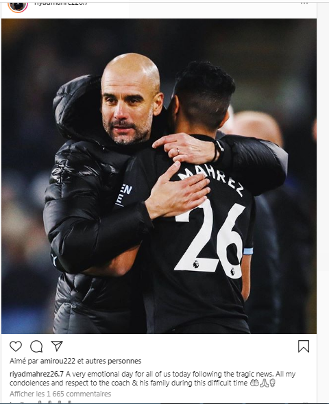 قدم اللاعب الدولي الجزائري رياض محرز تعازيه الخالصة لعائلة مدربه بيب غوارديولا الذي فقد والدته اليوم الإثنين متأثرة بفيروس كورونا المستجد.