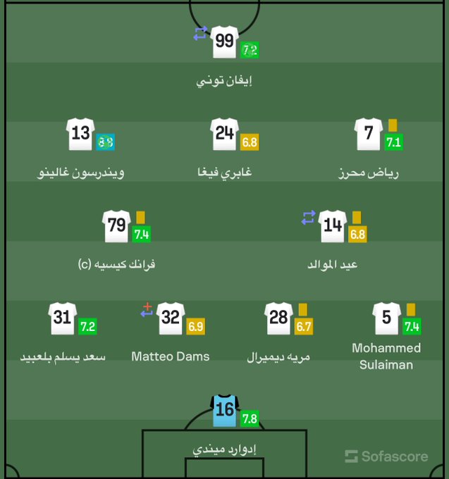 ونال رياض محرز تنقيطا مميزاً بـ 7.1 من 10، بالنظر إلى المستوى المثالي الذي قدمه في المباراة.