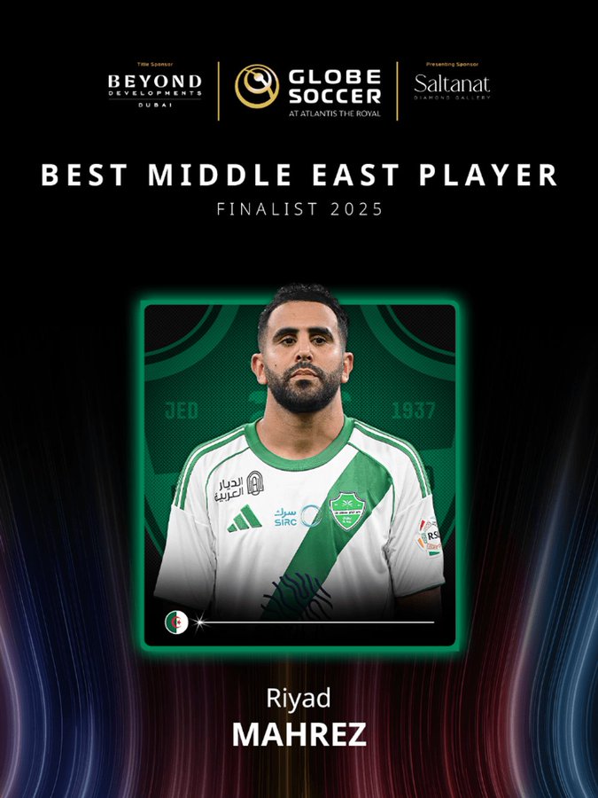 اختير الدولي الجزائري رياض محرز، ضمن قائمة اللاعبين المرشحين لنيل جائزة أفضل لاعب في الشرق الأوسط لعام 2025، التي تنظّمها مؤسسة “غلوب سوكر”.