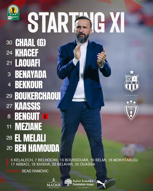 وجاءت التشكيلة الأساسية بوجود شعال في حراسة المرمى، وفي الدفاع كل من خاسف، لعوافي، بن عيادة وبكور، بينما ضم خط الوسط بوكرشاوي، كاسيس وبن غيث الذي سيحمل شارة القيادة. وفي الهجوم سيعتمد المدرب على الثلاثي مزيان، الملالي وبن حمودة.