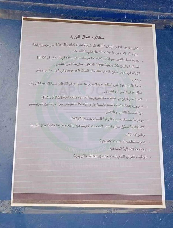في حين، طالب العمال، حسب البيان ذاته، بالزيادة في الأجور، وتطبيق وعود الإدارة حول تمكين كل عامل من يومين راحة عاجلة. والمساواة ورفع في قيمة منحة المردودية الفردية والجماعية. والزيادة في منحة الأرباح السنوية لجميع عمال البريد. وكذا صب منحة كورونا وتعويضات لفائدة عمال البريد مستخدمي القطاع خلال الجائحة.