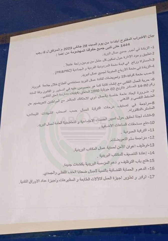 أغلقت بعض مراكز البريد، اليوم السبت، أبوابها في وجه المواطنين، معلنة عن دخولها في إضراب مفتوح -حسب منظمة حماية المستهلك-. و حسب بيان نشرته المنظمة، فإن الإضراب يبقى ساري حتى تلبية جميع الطلبات.