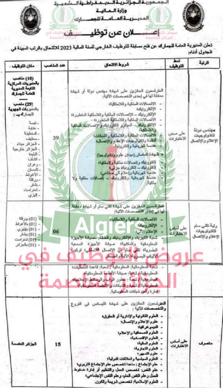 وحسبما أفادت به المديرية العامة للجمارك، فإن المناصب موزعة على الجزائر العاصمة وولايات أخرى في منصب مهندس دولة لتكنولوجيات الإعلام والاتصال ب 39 منصبا. وتقني سام لتكنولوجيات الإعلام والاتصال ب 06 مناصب. بالإضافة كذلك إلى متصرف ب 15 منصب.