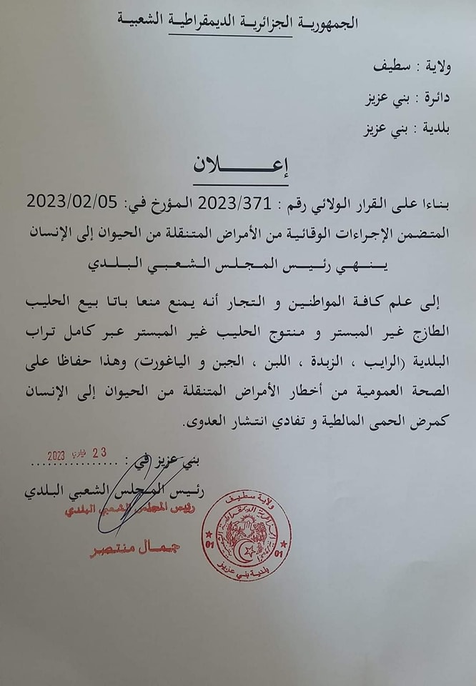 أنهى رئيس المجلس الشعبي اللبلدي لبلدية بني عزيز بولاية سطيف إلى كافة المواطنين والتجار عبر إقليم البلدية منع بيع الحليب الطازج غير المبستر.