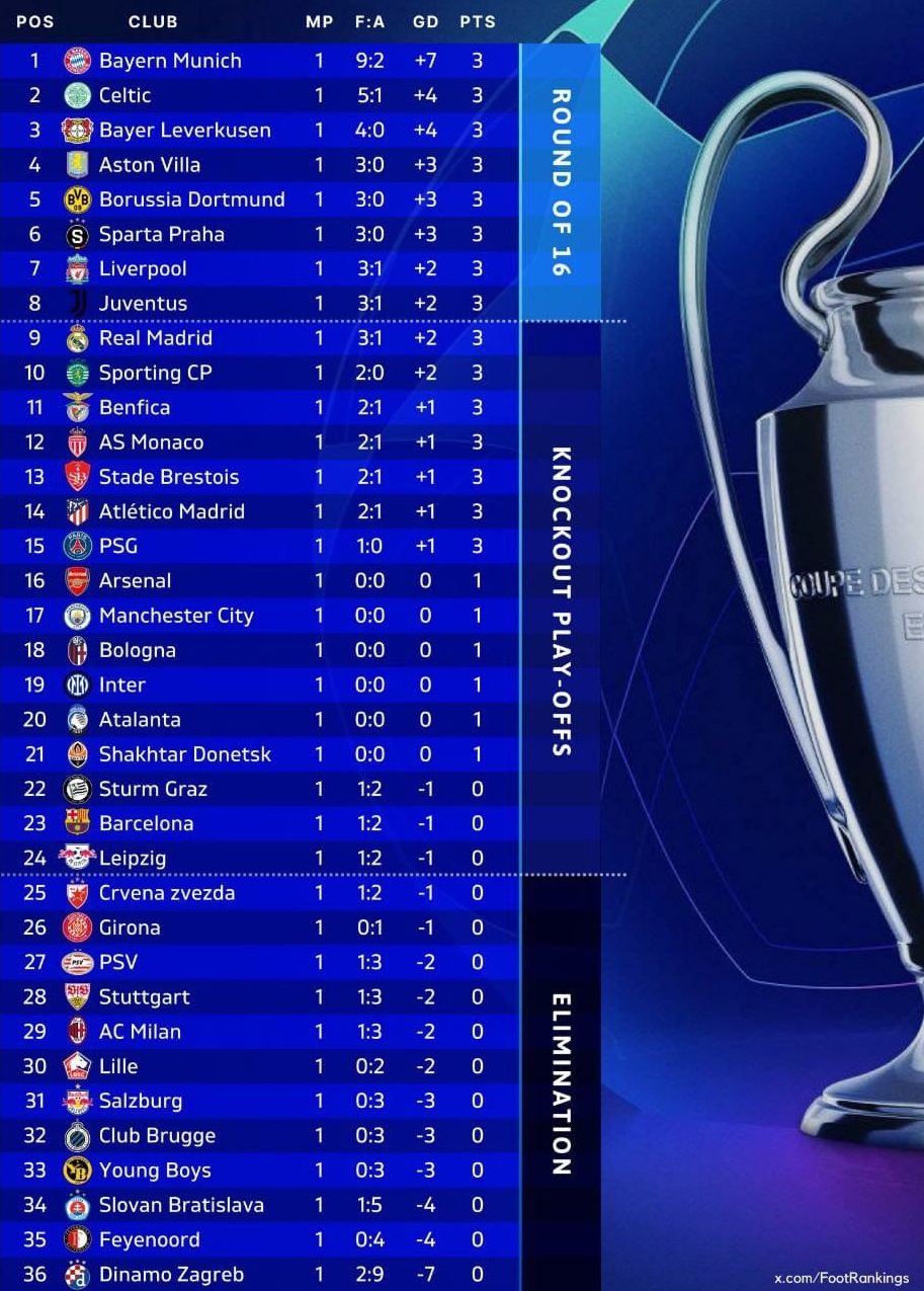 وإليكم جدول ترتيب بطولة دوري أبطال أوروبا بعد نهاية الجولة الأولى: