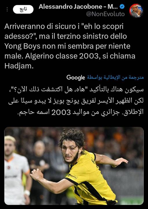 وقال الصحفي الشهيير “ألكسندرو جاكوبو” عبر صفحته الرسمية على “تويتر” عقب المباراة في حق مدافع الخضر: “جزائري من مواليد 2003.. اسمه حجام لا يبدو سيئا على الإطلاق”.