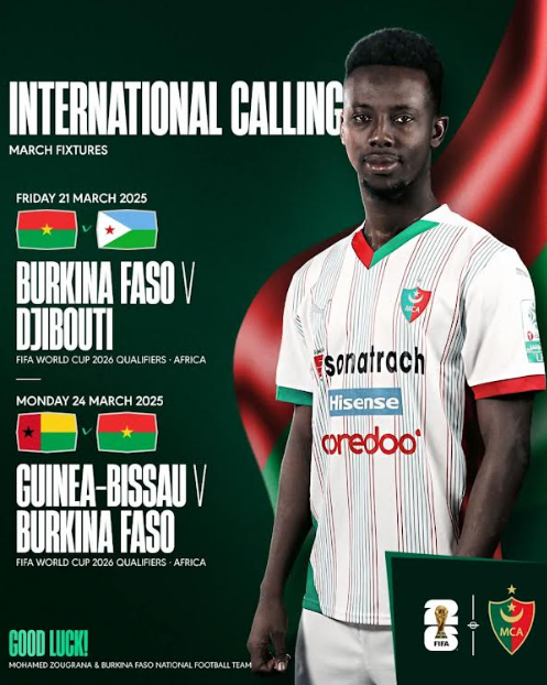 وأعلنت إدارة مولودية الجزائر، اليوم الأربعاء، عن تلقيها استدعاء رسمي، من طرف الاتحاد البوركينابي، خاص باللاعب زوغرانا، لتمثيل منتخب بوركينا فاسو.