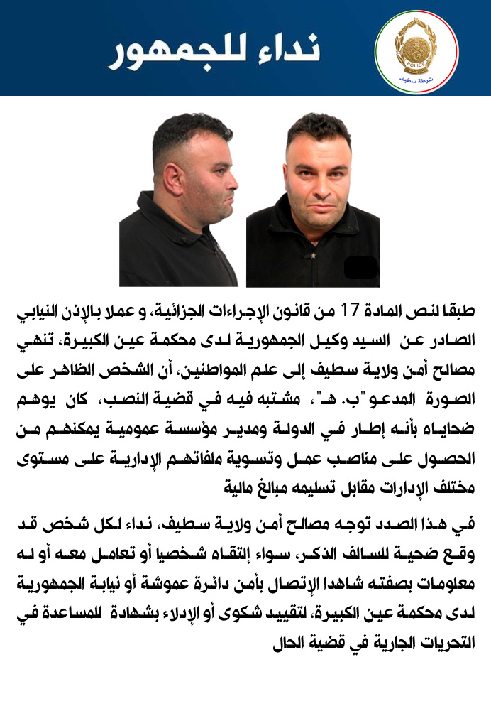 أنهت مصالح أمن ولاية سطيف إلى علم المواطنين أن الشخص الظاهر على الصورة المرفقة والمدعو “ب.ه” مشتبه فيه في قضية النصب.