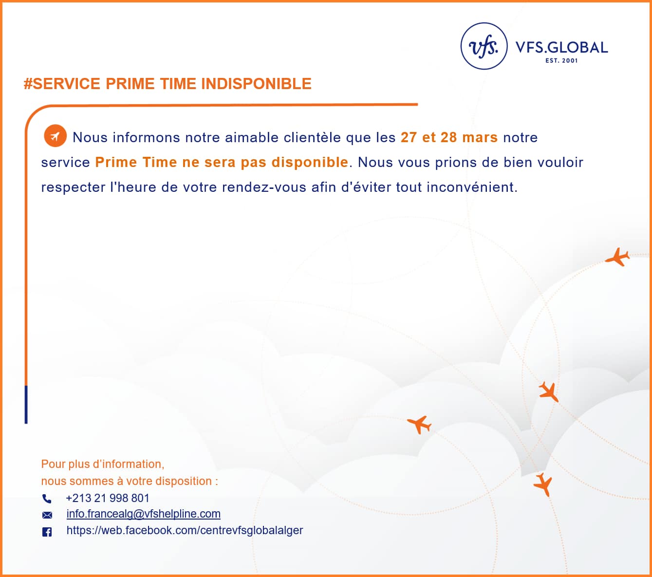 وجاء في بيان VFS Global: “نبلغ عملائنا الكرام أنه في 27 و28 من شهر مارس لن تكون خدمة Prime Time متاحة، ونرجو منكم احترام وقت الموعد لتجنب أي إزعاج.”