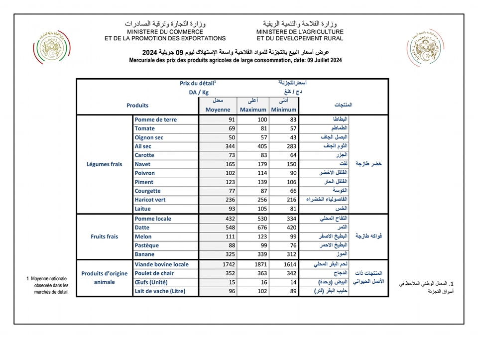 وجاء في صفحة الوزارة على فايسبوك، عرض أسعار البيع بالتجزئة للمواد الفلاحية واسعة الاستهلاك لليوم الثلاثاء 9 جويلية 2024.