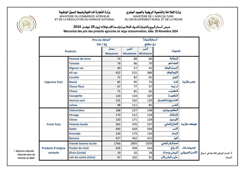 وجاء في صفحة الوزارة على فايسبوك، عرض أسعار البيع بالتجزئة للمواد الفلاحية واسعة الاستهلاك ليوم الخميس 28 نوفمبر 2024.