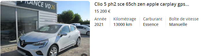 ووجدنا أيضا سيارة من نوع كليو 5 يعود تاريخها إلى 2021 بسعر 15200 أورو أي حوالي 334 مليون.