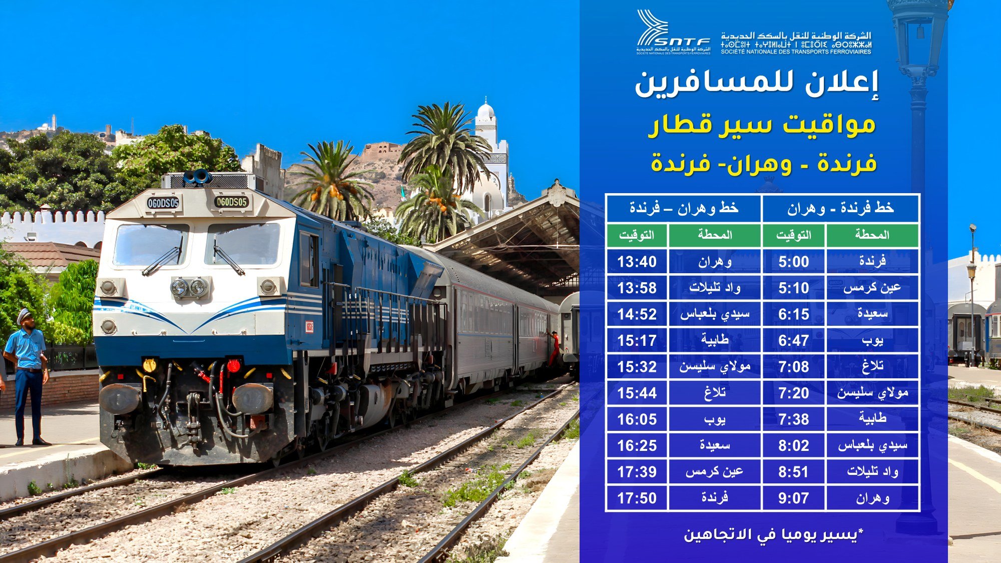 أعلنت الشركة الوطنية للنقل بالسكك الحديدية عن مواقيت جديدة لرحلات القطار على خط “وهران- فرندة- وهران”.