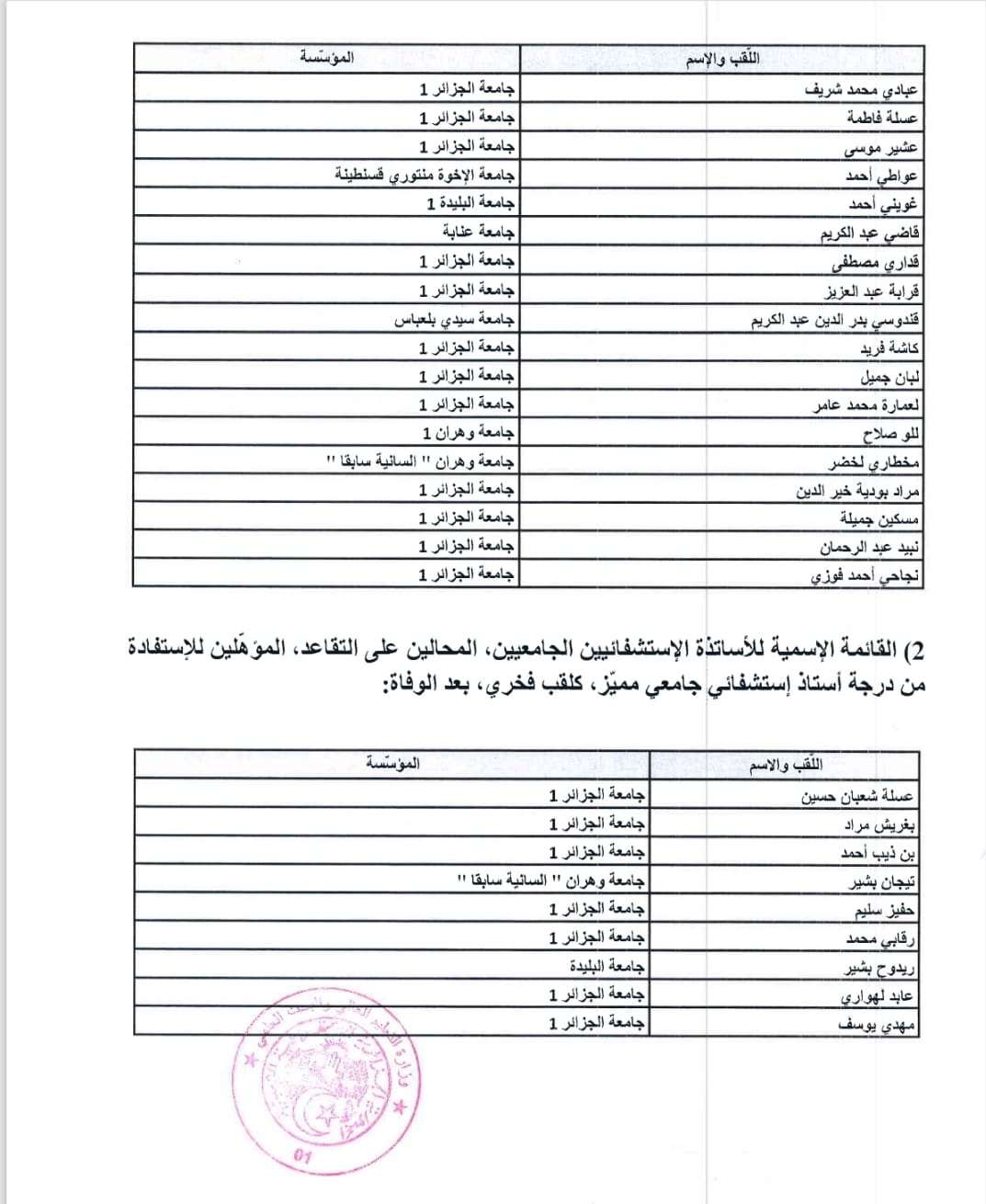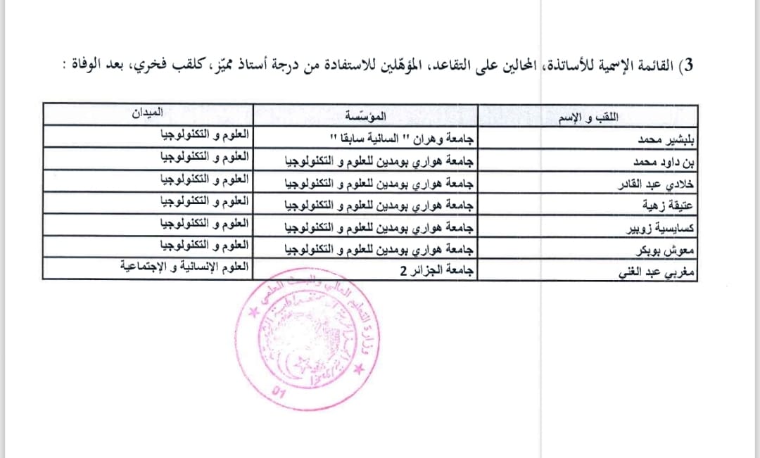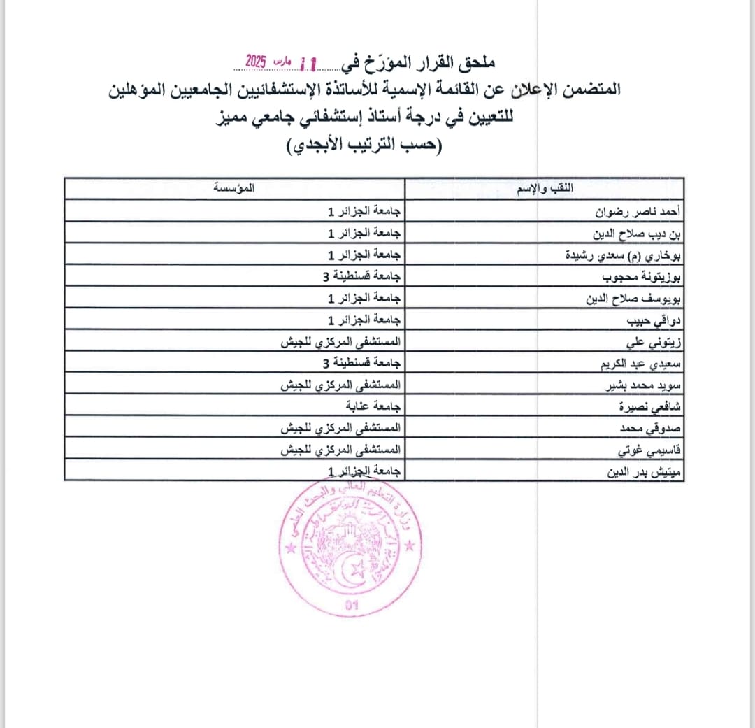 نشر وزير التعليم العالي والبحث العلمي كمال بداري القائمة الإسمية للأساتذة الجامعيين الحاملين لرُتبة درجة أستاذ استشفائي جامعي مميّز، ودرجة أستاذ مميز.