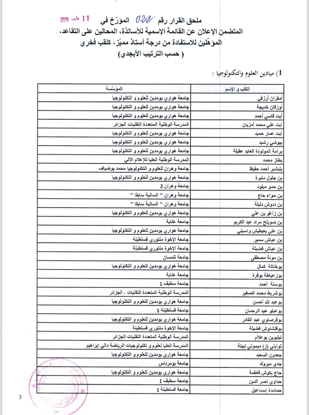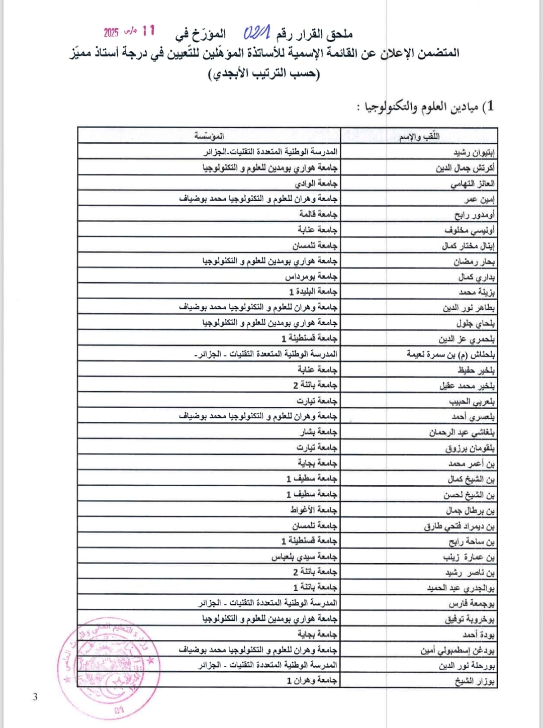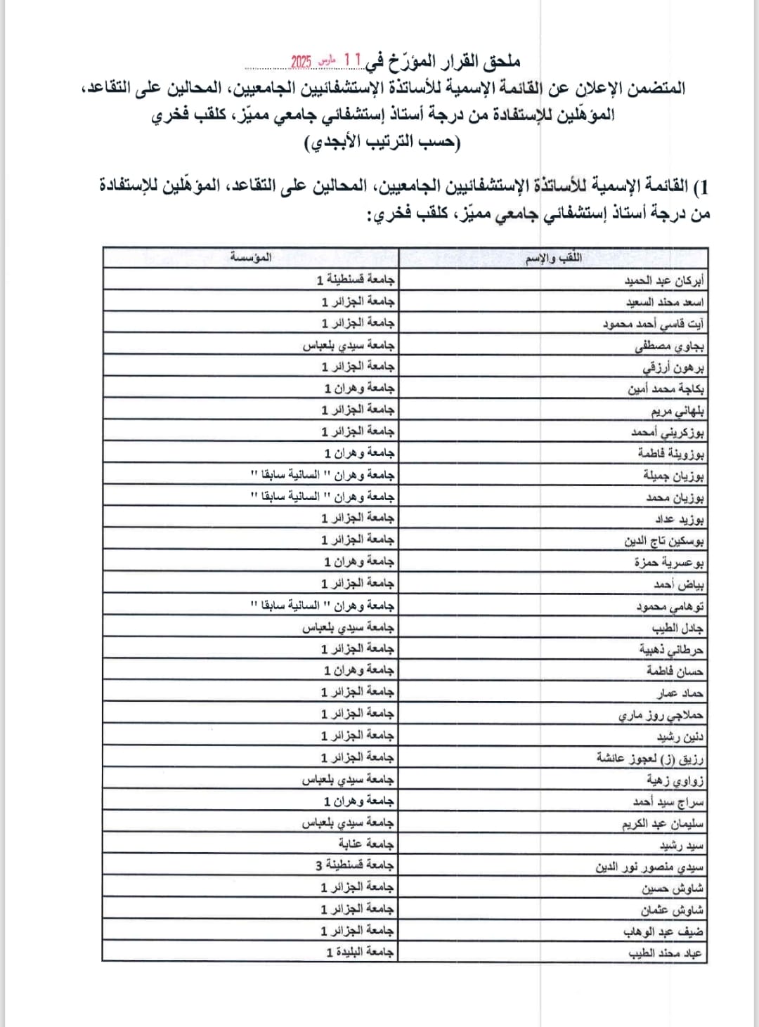 نشر وزير التعليم العالي والبحث العلمي كمال بداري القائمة الإسمية للأساتذة الجامعيين الحاملين لرُتبة درجة أستاذ استشفائي جامعي مميّز، ودرجة أستاذ مميز.