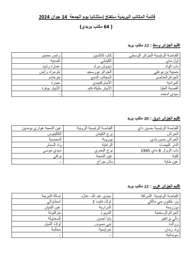 ستقوم مصالح ولاية الجزائر، بفتح بعض المكاتب البريدية استثناءا يوم الجمعة 14 جوان 2024، من الساعة 08:00 سا إلى غاية منتصف النهار 12:00 سا.