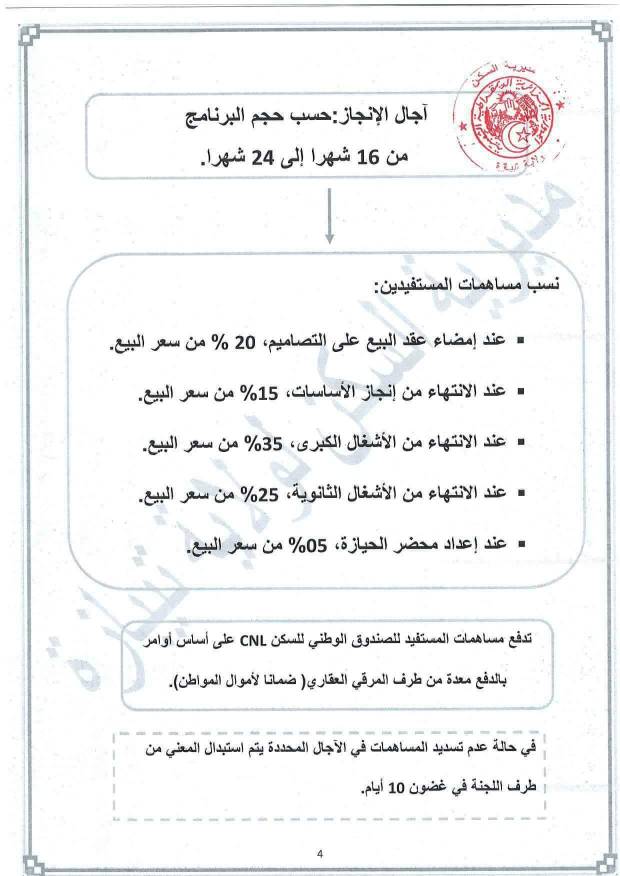 على أن تدفع مساهمات المستفيد للصندوق الوطني للسكن CNL على أساس أوامر للدفع معدة من طرف المرقي ضمانا لأموال المواطن.