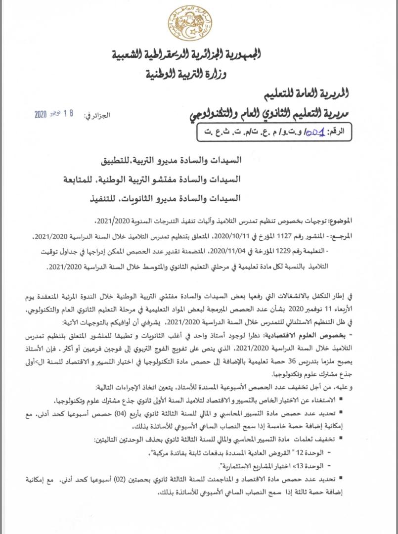 وخصت بالذكر العلوم الإقتصادية، حيث سيتم الإستغناء عن الإختيار الخاص بالتسيير والإقتصاد لتلاميذ السنة الأولة ثانوي جذع مشترك علوم وتكنولوجيا.