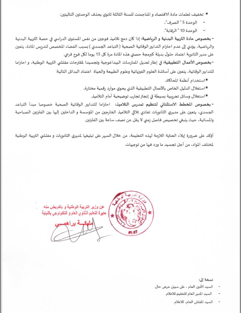 أما بخصوص مادة التربية البدنية و الرياضية، فتم اقتراح اعتماد حلول بديلة كبرمجة حصتي هذه المادة مرة كل 15 يوما لكل فوج فرعي.