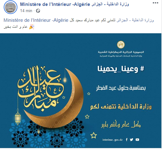 وزارة الداخلية تهنىء الجزائريين بعيد الفطر
