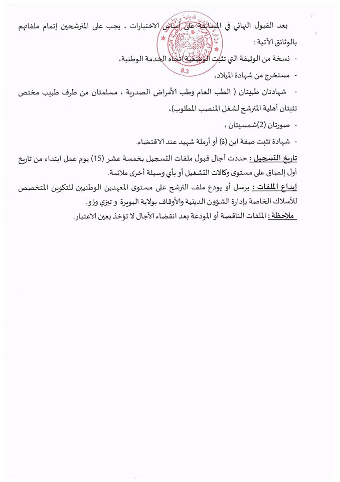 وبخصوص تاريخ التسجيل، حددت الوزارة أجال قبول ملفات التسجيل بخمسة عشر (15) يوم . ابتداء من تاريخ أول إلصاق على مستوى وكالات التشغيل أو بأي وسيلة أخرى ملائمة. ويرسل أو يودع ملف الترشح على مستوى المعهدين الوطنيين للتكوين المتخصص للأسلاك الخاصة بإدارة الشؤون الدينية والأوقاف بولاية البويرة وتيزي وزو.